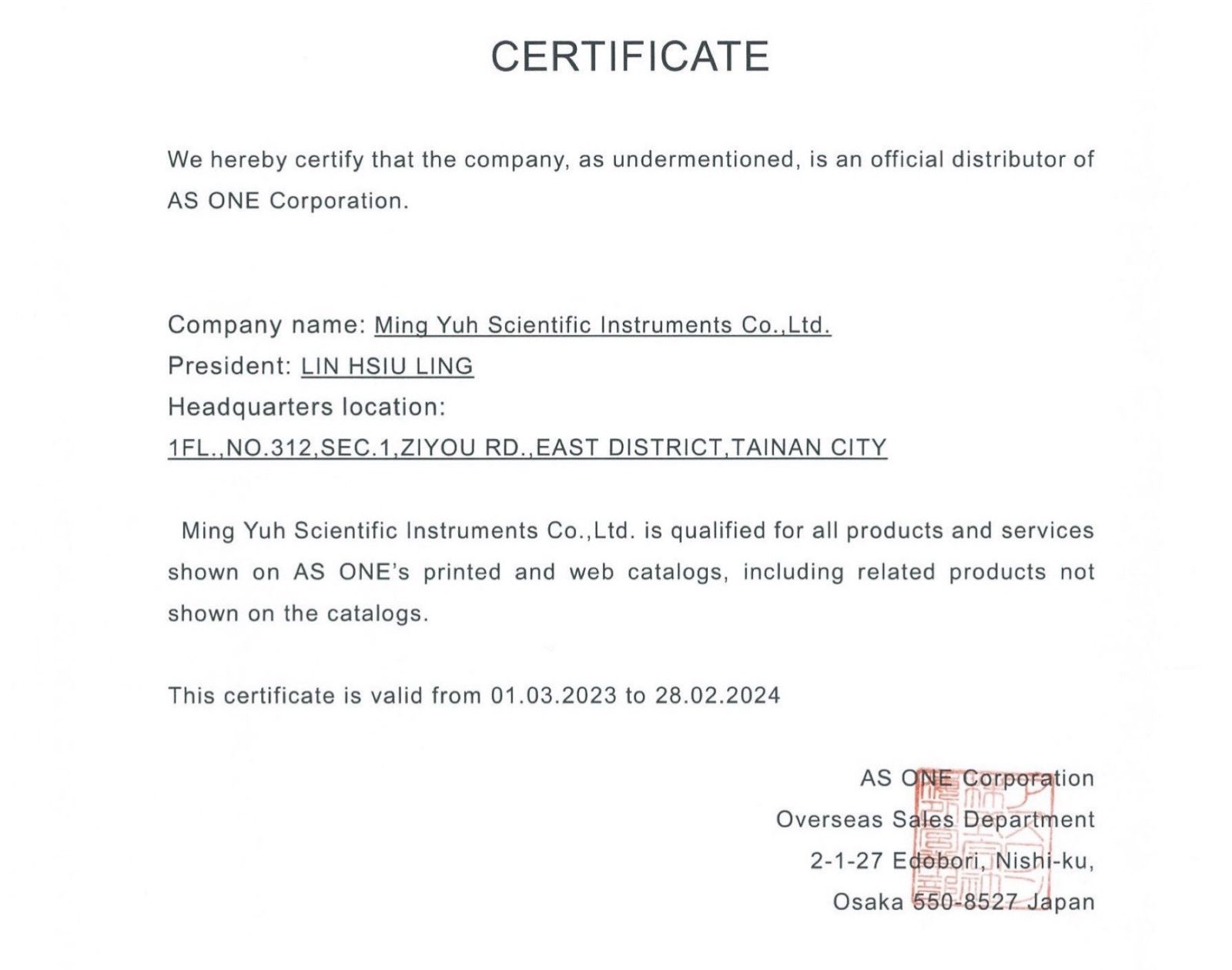 AS ONE CORPORATION(アズワン株式会社 )創立於1933年,主要從事科學研究設備耗材、護理器材及工業用具的銷售及服務,至今已有91年的歷史。目前為日本國內理化儀器設備市占第一的品牌,也是日本國內少數販售理化儀器的上市櫃公司。2020年受到疫情侵襲,全球經濟重創的情況下,AS ONE 卻是逆勢成長並積極的拓展海外市場。本公司非常榮幸於2021年底,AS ONE CORPORATION位於大阪的總部主動聯繫本公司尋求合作機會,並在全體工作同仁的努力下,在2022年通過了原廠的觀察期;於2023年正式成為原廠授權之台灣代理商。